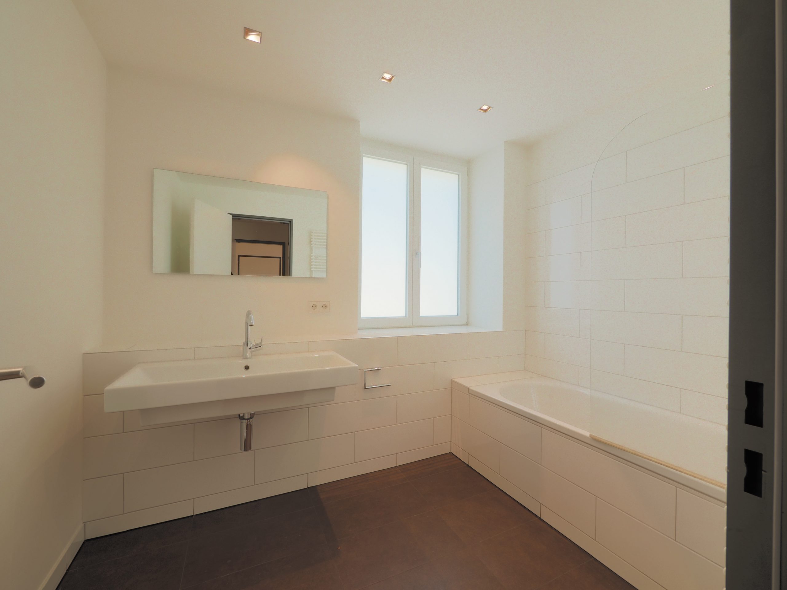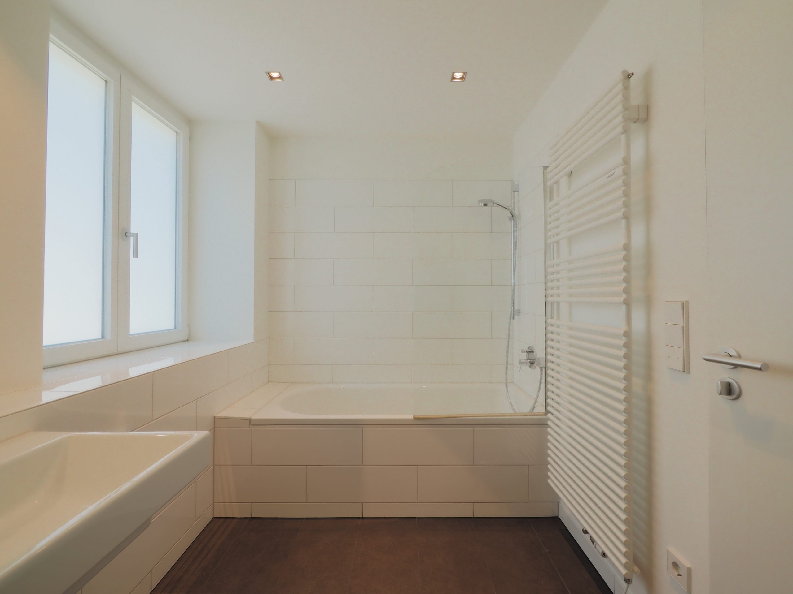 - Tageslichtbad mit Badewanne, moderner großer Waschtisch und Handtuchheizkörper; Sanitär weiß