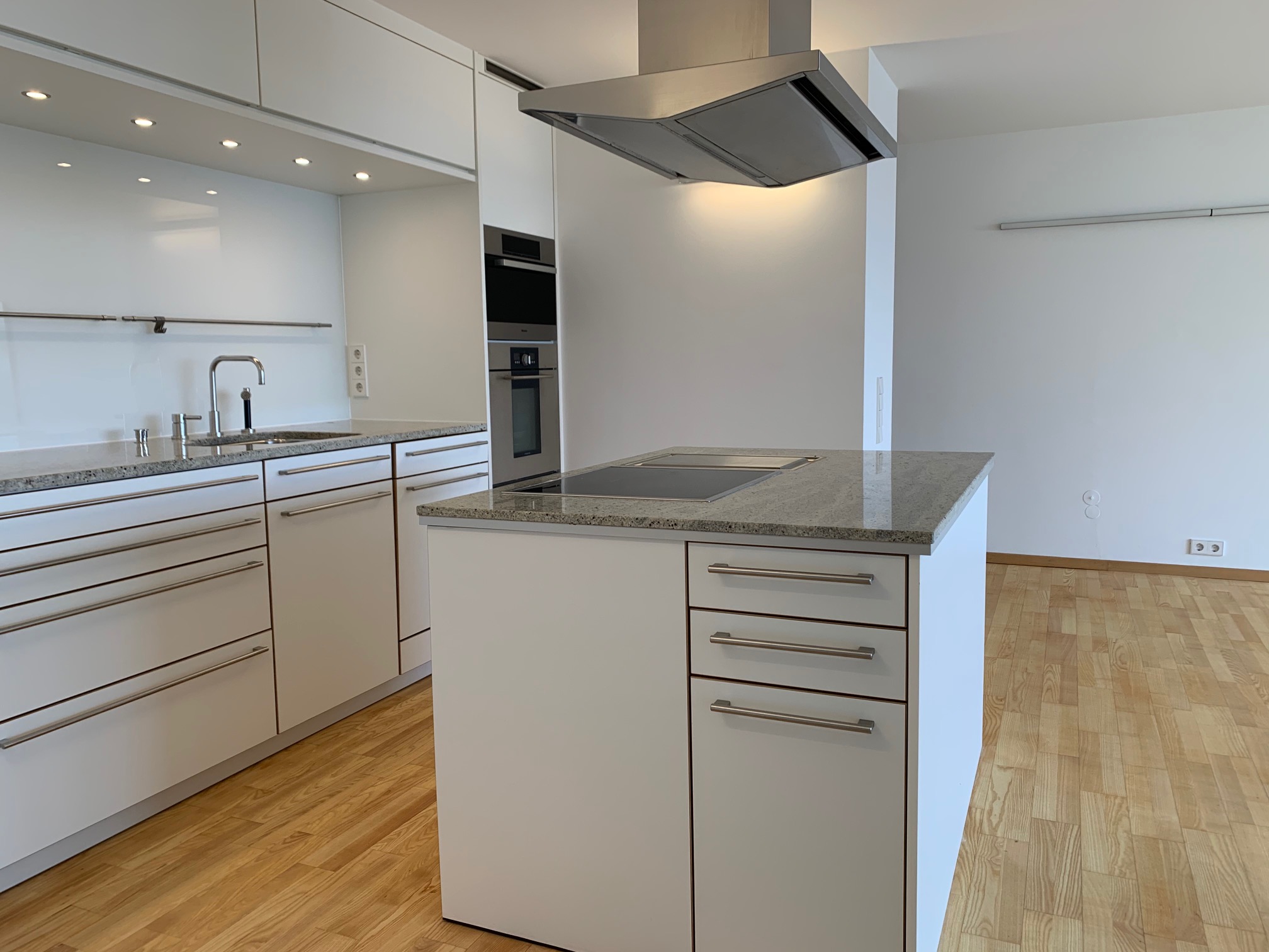 - offener Wohn-Essbereich mit Küche und Kochinsel und Zugang zur Terrasse