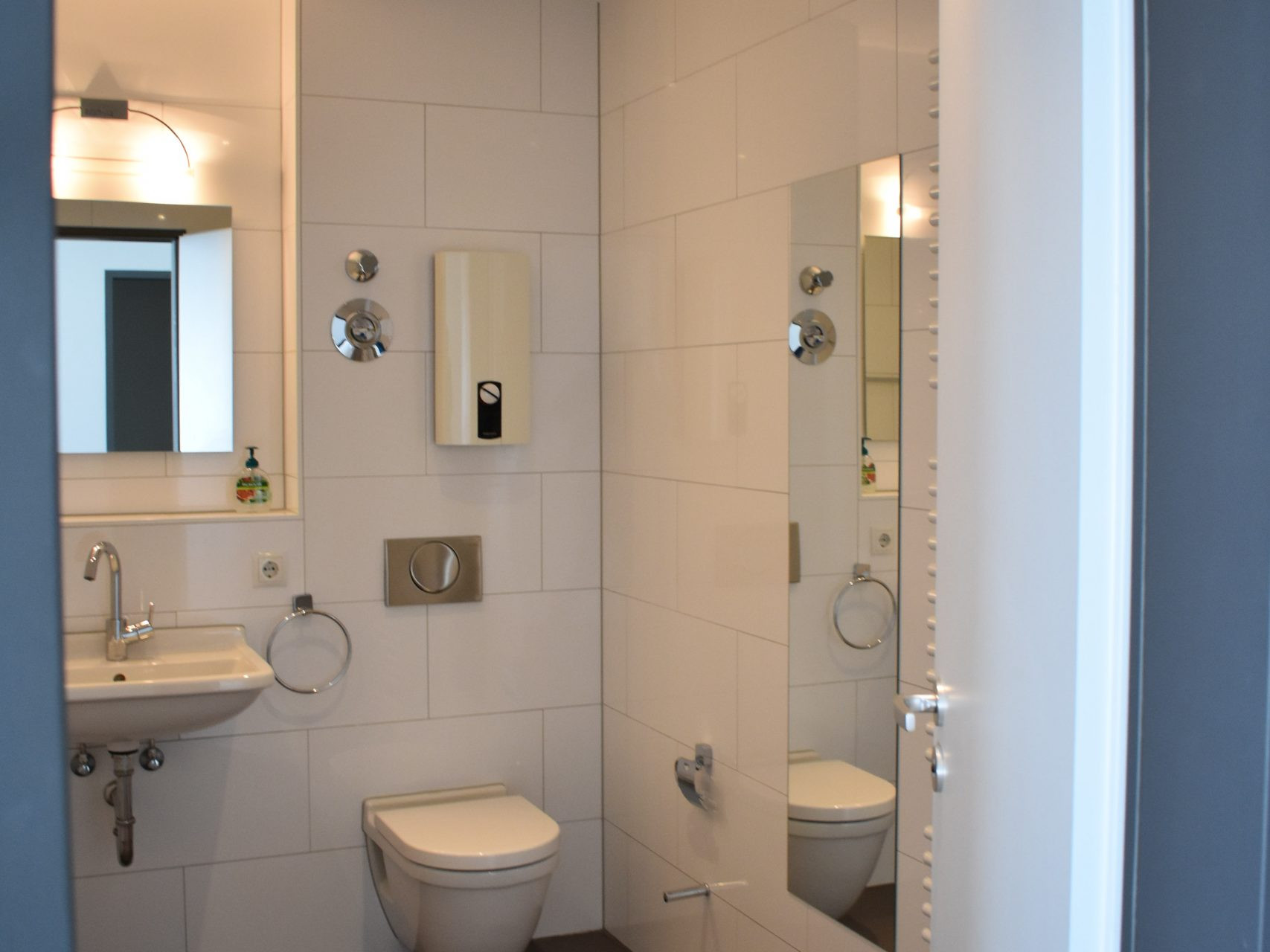 - Badezimmer mit Waschtisch, Badewanne und WC, beheizbarer Handtuchwärmer, weißes Sanitär