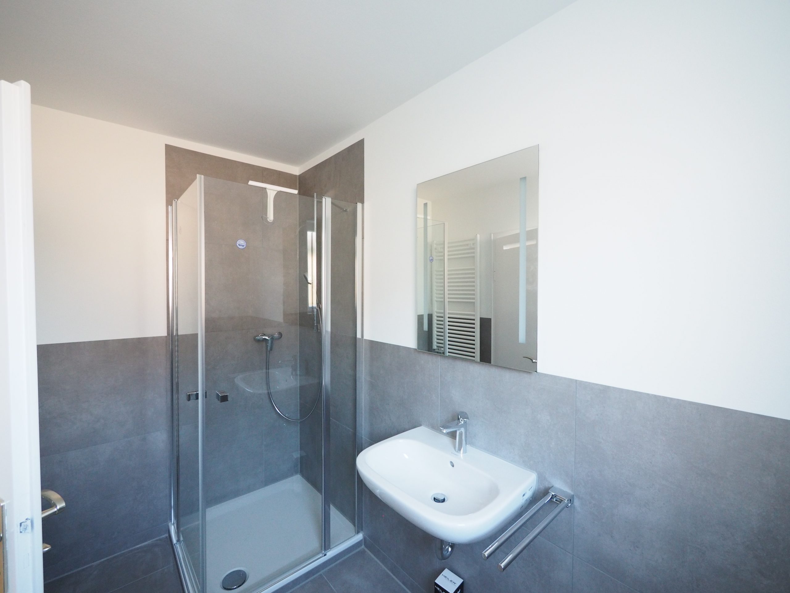 - Badezimmer mit Waschtisch, Unterbauten und Spiegel