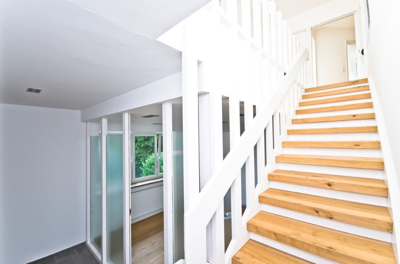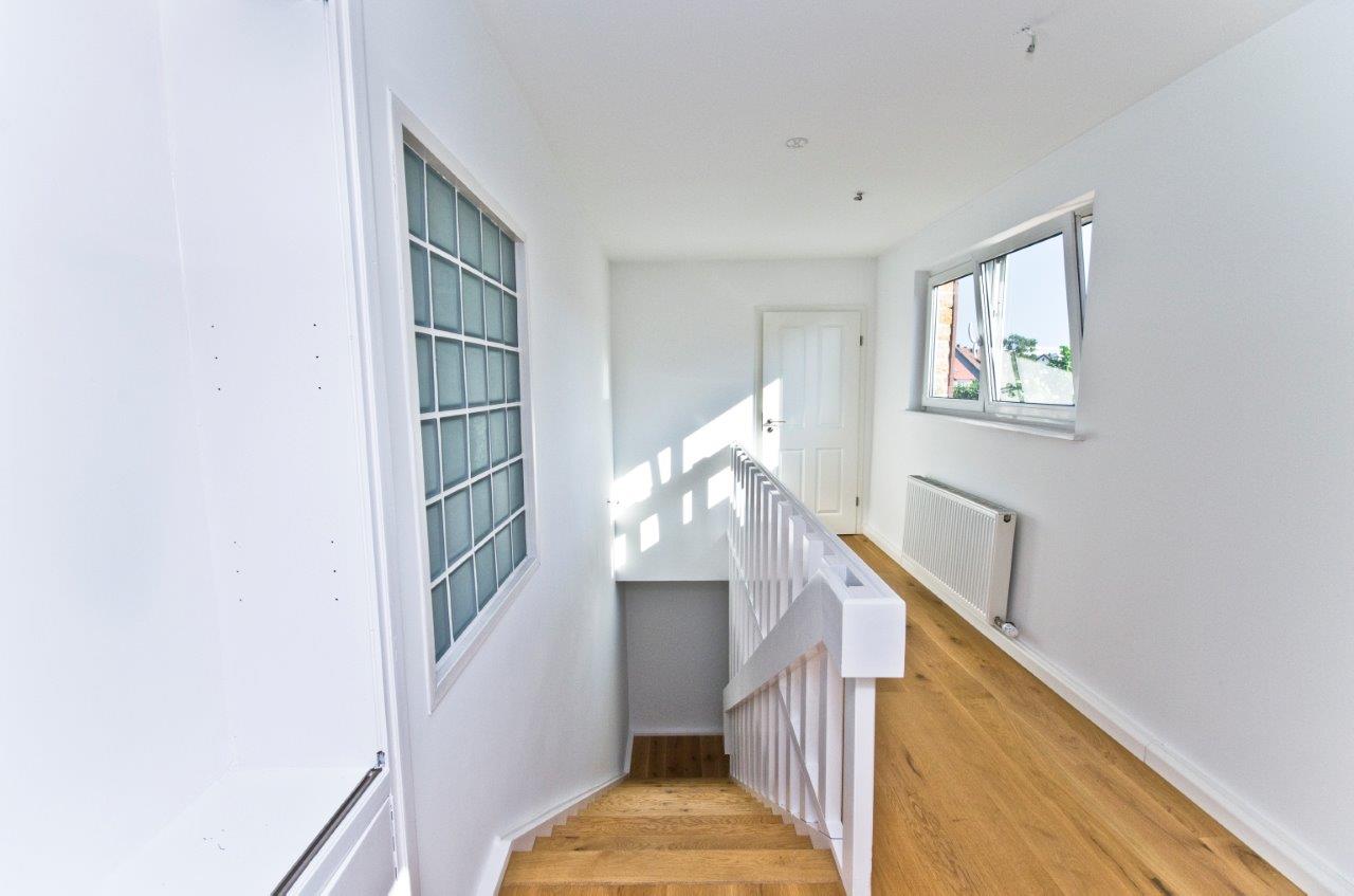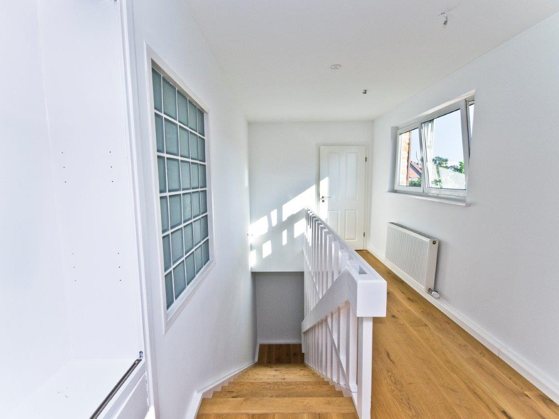 Der Eingangsbereich mit Büro bzw. Gästezimmer befindet sich im Erdgeschoss. Über eine schöne Holztreppe gelangt man ins Obergeschoss. Dieses besteht aus einer Galerie mit Abstellraum, separates Gäste-WC, einem modernen Tageslichtbad mit Badewanne, Dusche, 2 Waschtischen und WC. Über einen großzügigen Flur gelangt man in das großzügige Schlafzimmer.