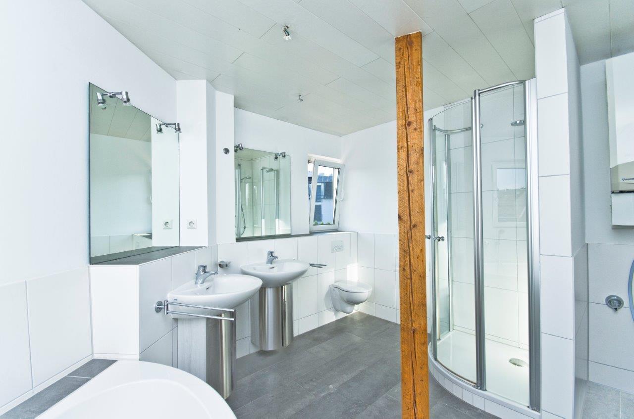• Modernes, lichtdurchflutetes Bad mit Eckbadewanne, Dusche, 2 Waschtische und WC (Sanitär weiß), Waschmaschinenanschluss
