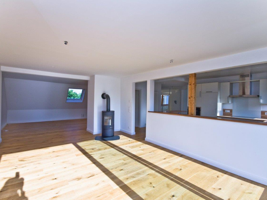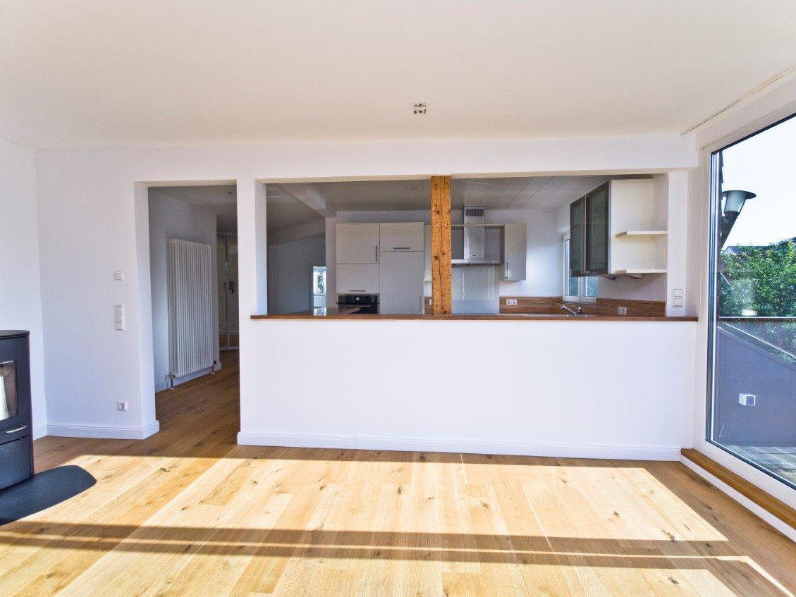 Nebenan befindet sich das Wohn-/ Esszimmer mit Schwedenofen und angrenzender offener Küche mit Theke und Zugang zum schönen Balkon mit elektr. Markise. Sowie ein weiteres Schlafzimmer.