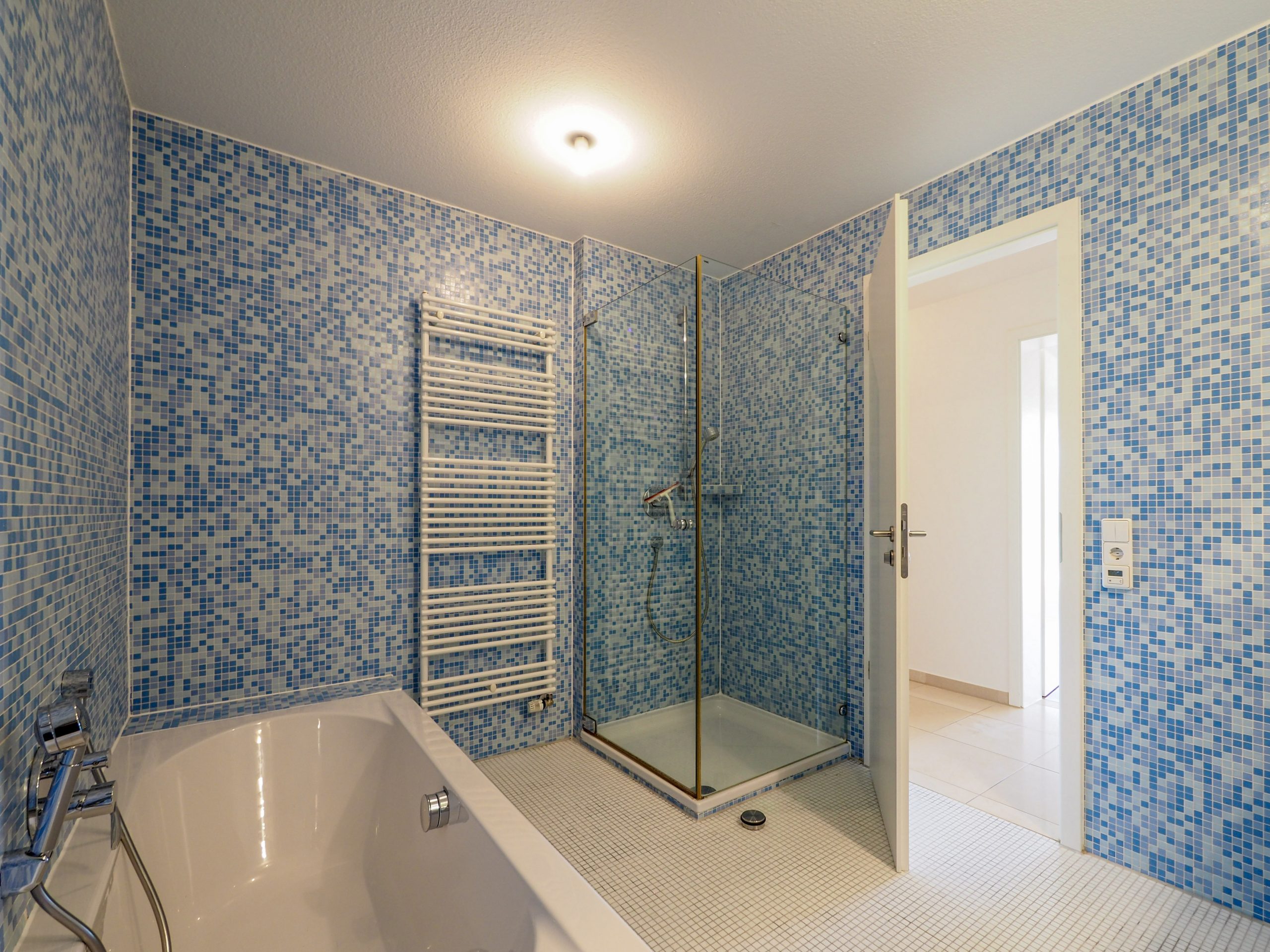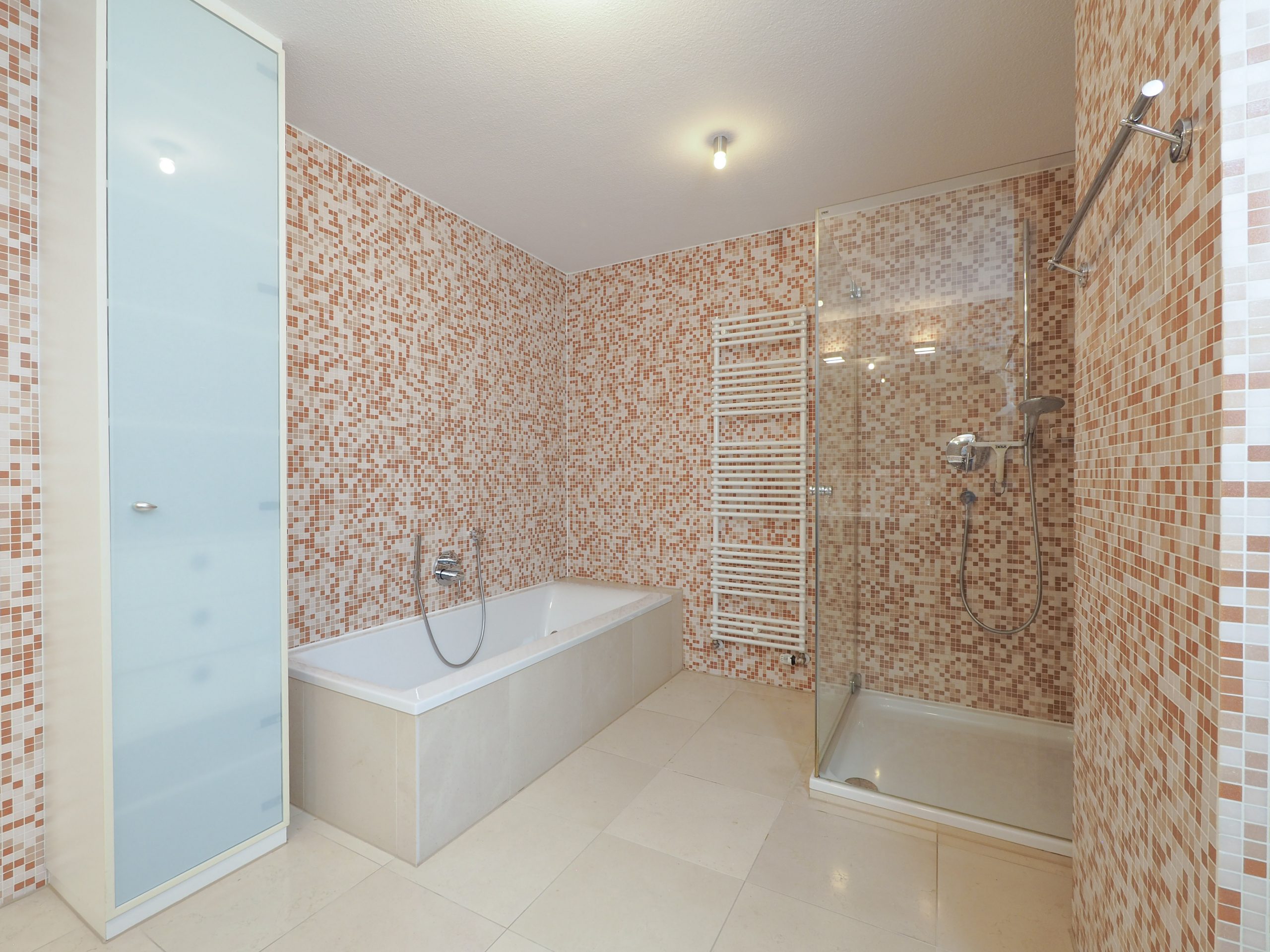 - Hauptschlafzimmer mit Bad-En-Suite mit Badewanne und Dusche, sep. WC und Ankleide inkl. Einbauten; Zugang zu Terrasse und Garten