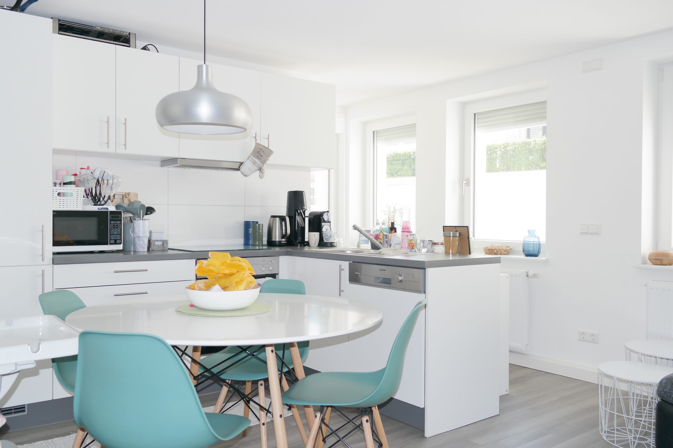 - Weiße Einbauküche mit Siemens-Elektrogeräten (Ceran-Kochfeld mit Herd, Spülmaschine und Kühlschrank)
