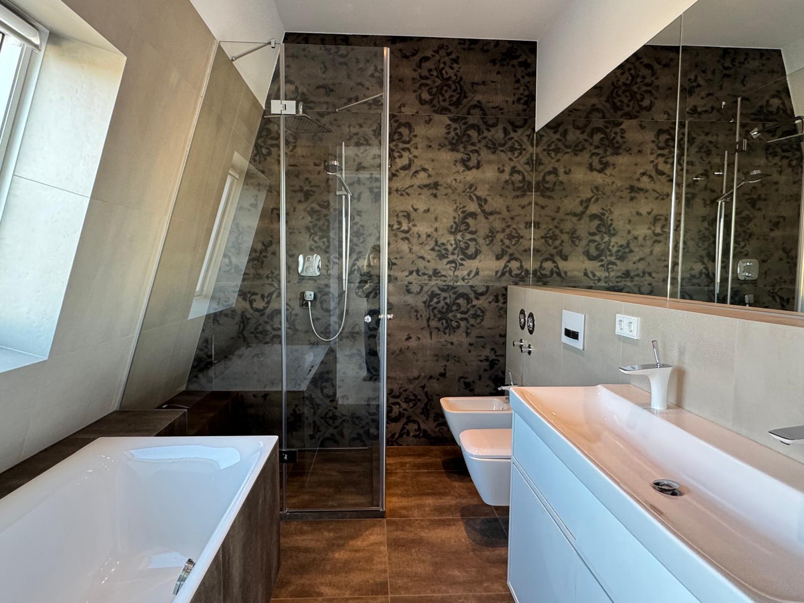 Zwei elegante Tageslichtbäder bieten höchsten Wohnkomfort: Das Masterbad lädt mit einer stilvollen Badewanne zum Entspannen ein, während das zweite Bad mit Dusche und Bidet die Funktionalität perfekt ergänzt. Ein besonderes Highlight bildet die ca. 45 m² große Terrasse in Kombination mit der Süd-West-Loggia – ein privater Rückzugsort für sonnige Stunden und spektakuläre Ausblicke über die Dächer der Stadt.