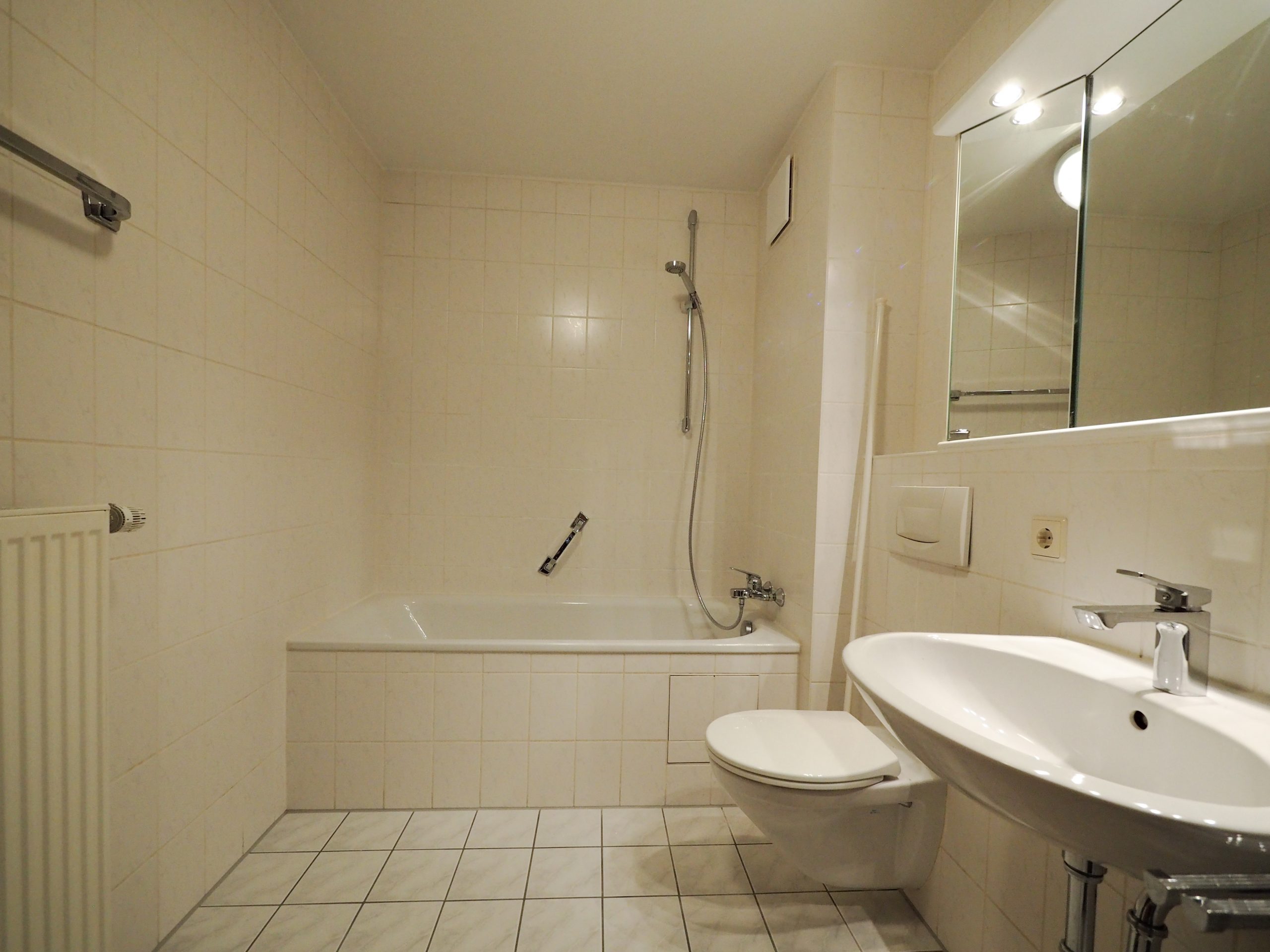 - Badezimmer mit Badewanne, Waschtisch, WC und Waschmaschinenanschluss