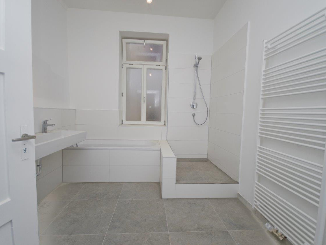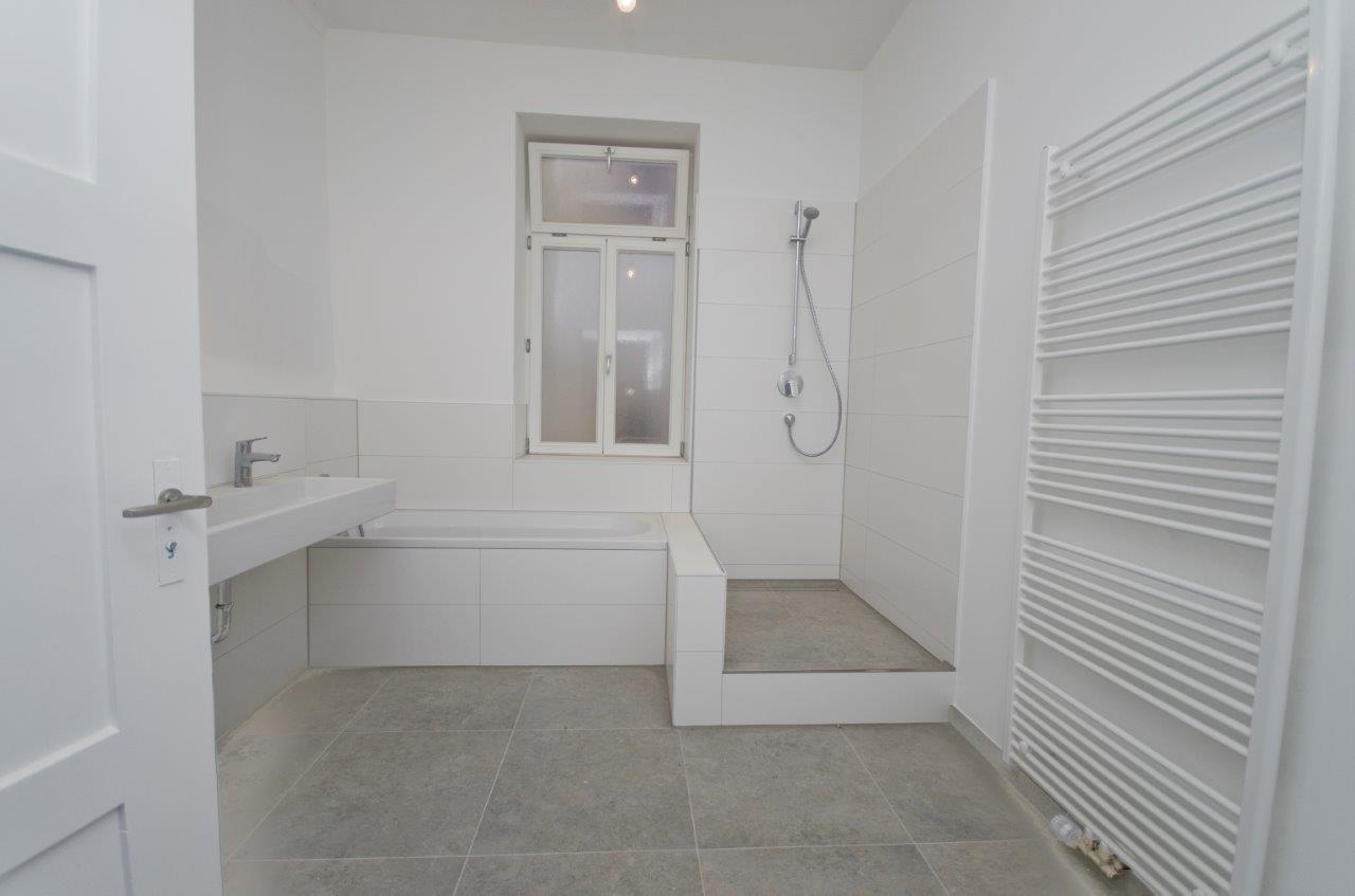 - Großzügiges weiß gefliestes Tageslichtbad mit Badewanne, Dusche, zwei Waschbecken, WC