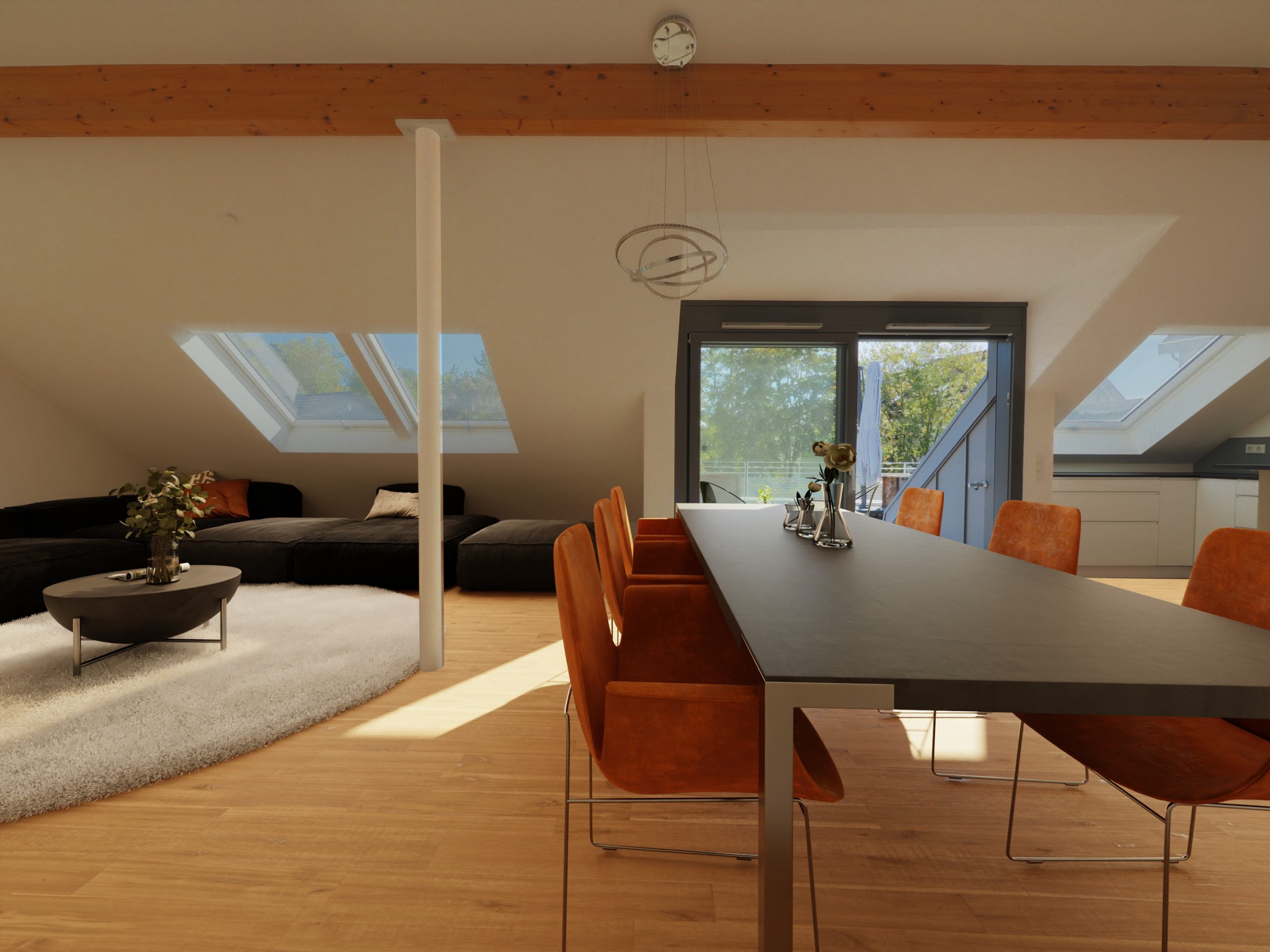 Die Wohnung verfügt über einen ca. 35 m² großen, lichtdurchfluteten Wohn- und Essbereich mit Zugang zur außergewöhnlich großen, nach Süden ausgerichteten, Dachterrasse mit traumhaftem Blick ins Grüne. In diesem sonnenverwöhnten Teil der modernen Wohnung, befindet sich auch die exklusive Einbauküche samt allen elektrischen Geräten.