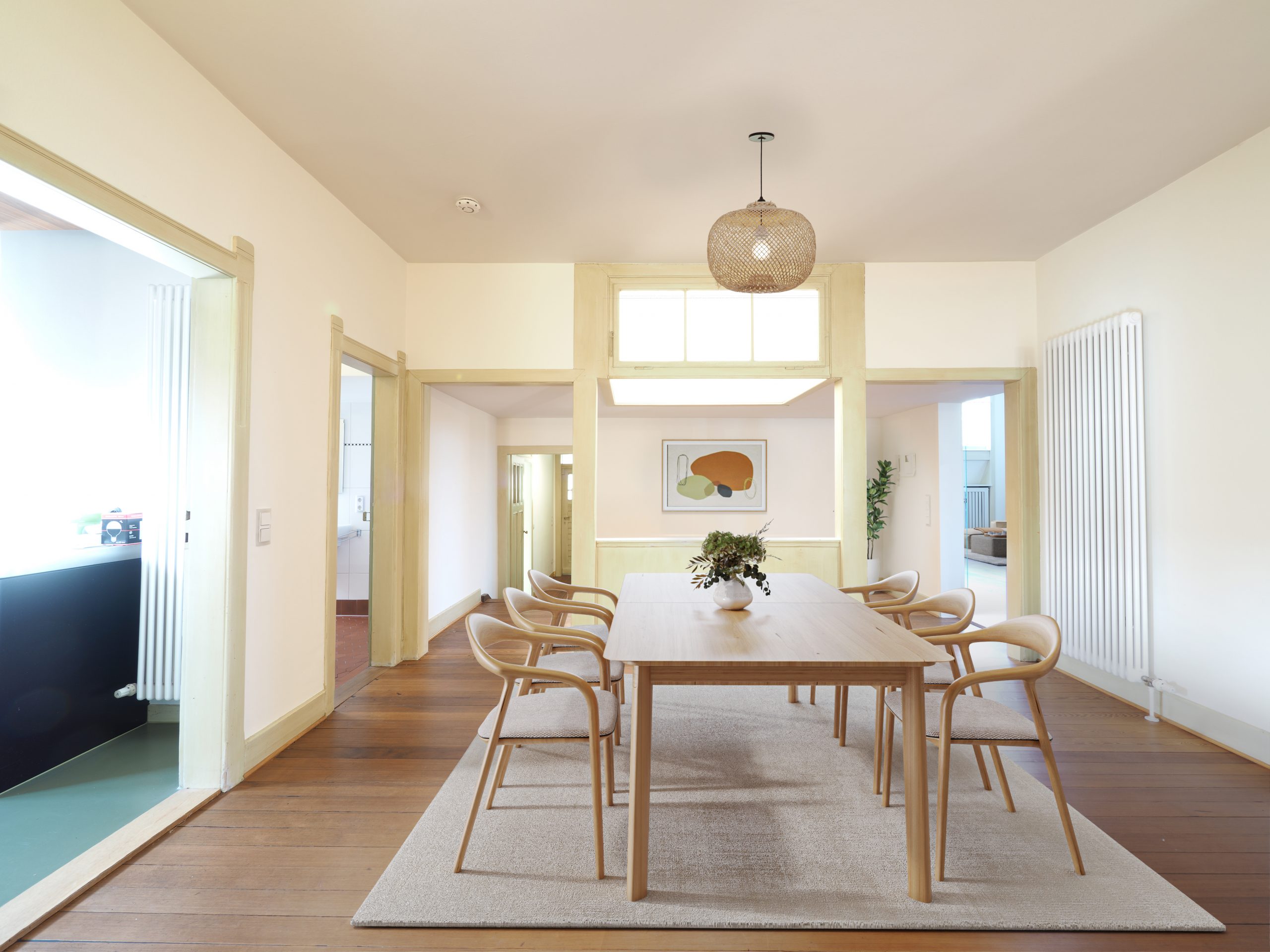 Originale Holzböden, Türrahmen und weitere Ausstattungsmerkmale wurden nicht nur erhalten, sondern aufwendig restauriert. Selbst Türbeschläge wurden, passend zu noch vorhandenen Originalen, originalgetreu nachgegossen. Auch die Farbgestaltung wurde mit Blick auf den typischen Stil des Jugendstils abgestimmt und unterstreicht den besonderen Charakter der Wohnung.