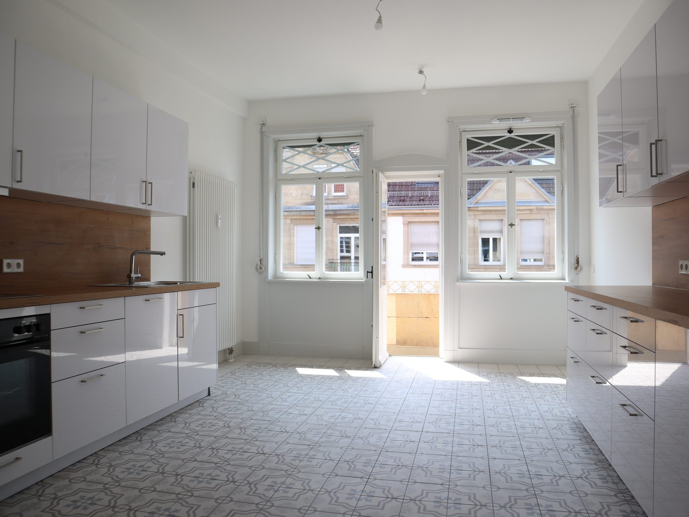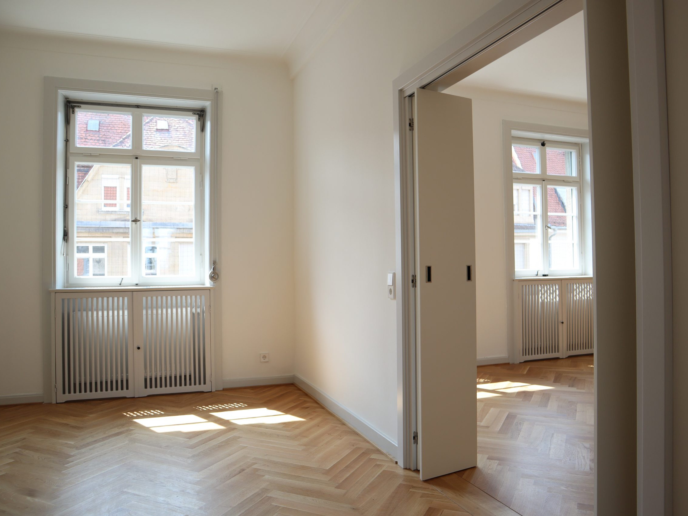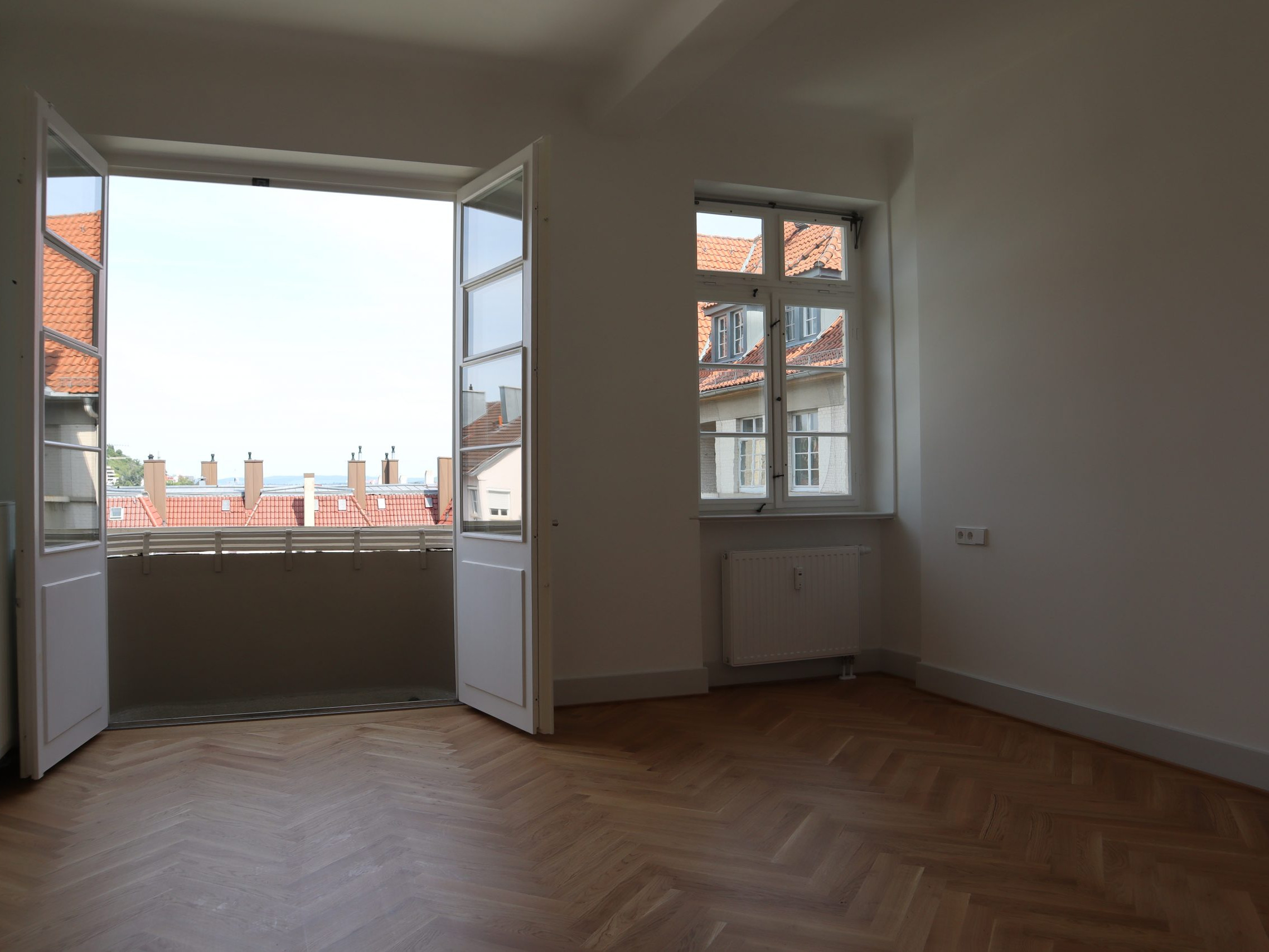 Zwei Balkone ermöglichen sonnige Stunden im Freien. Der Fußboden in Fischgrät-Eichenparkett erinnert an das historische Original, während in den Bädern und in der Küche Fliesen im Stil der Bauzeit harmonisch eingesetzt wurden.