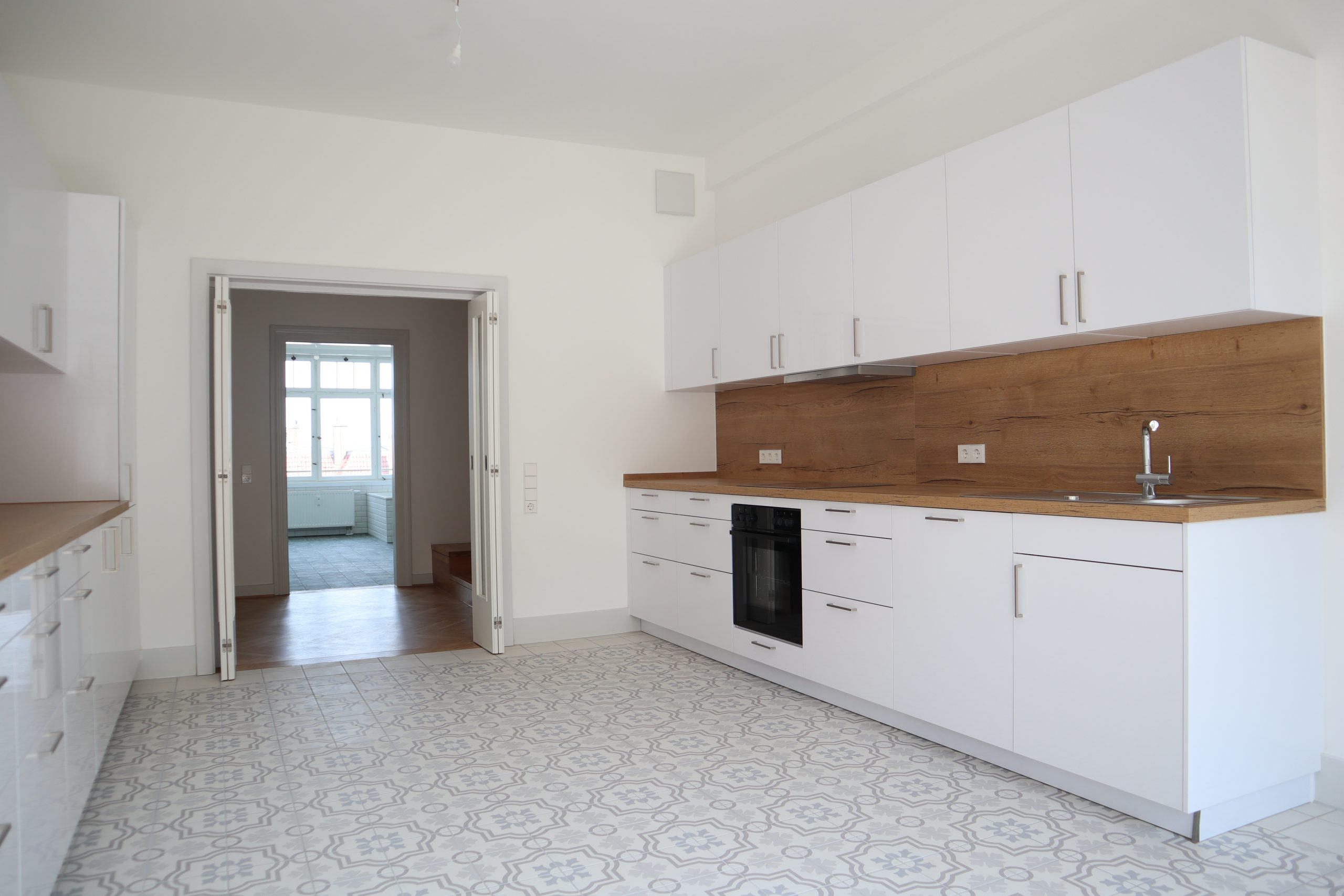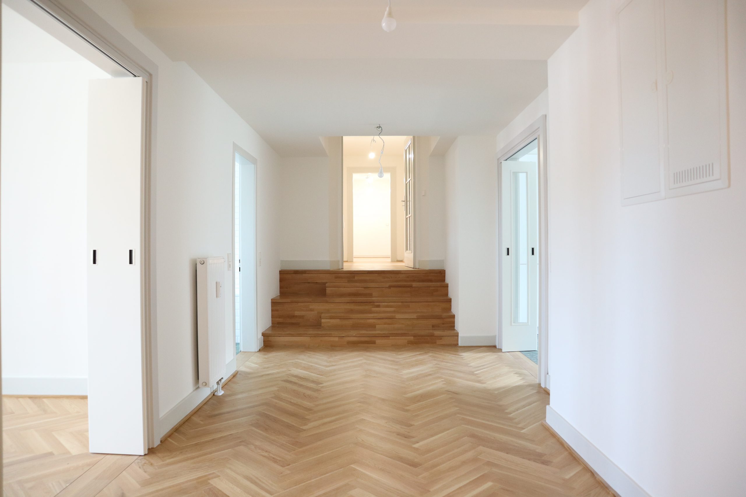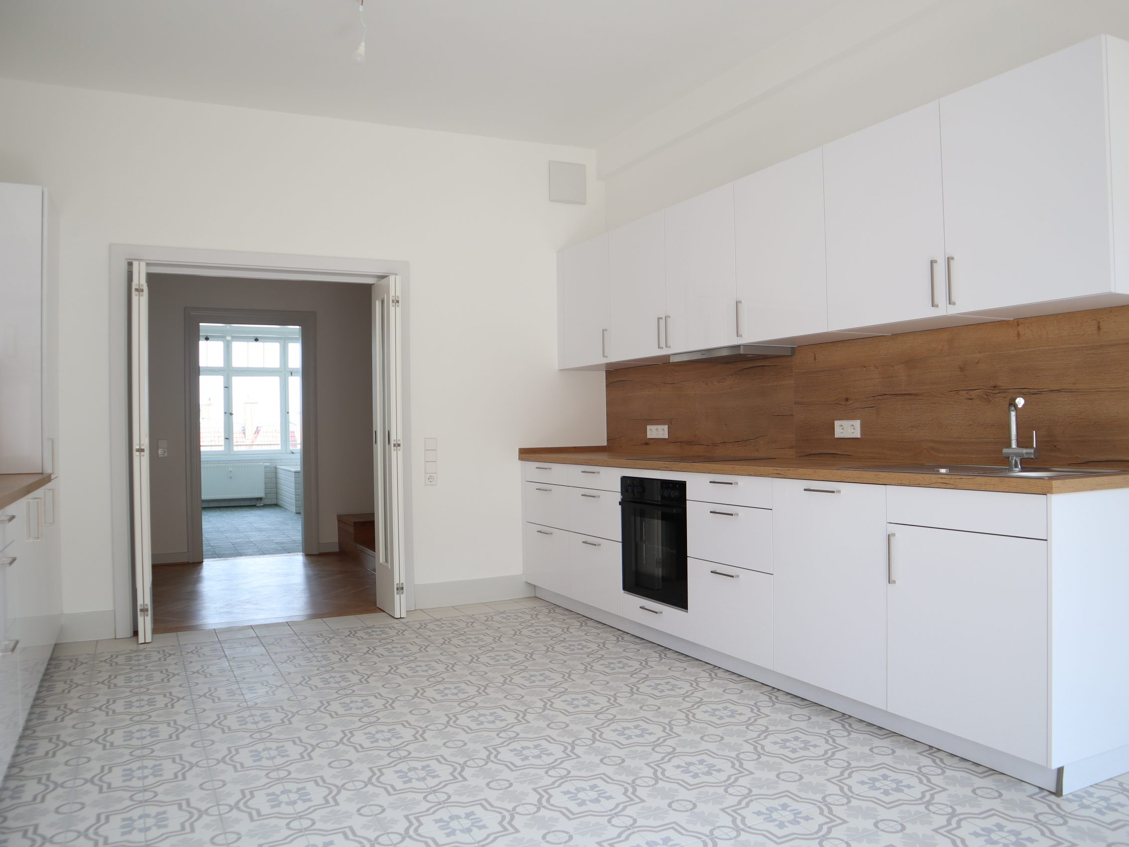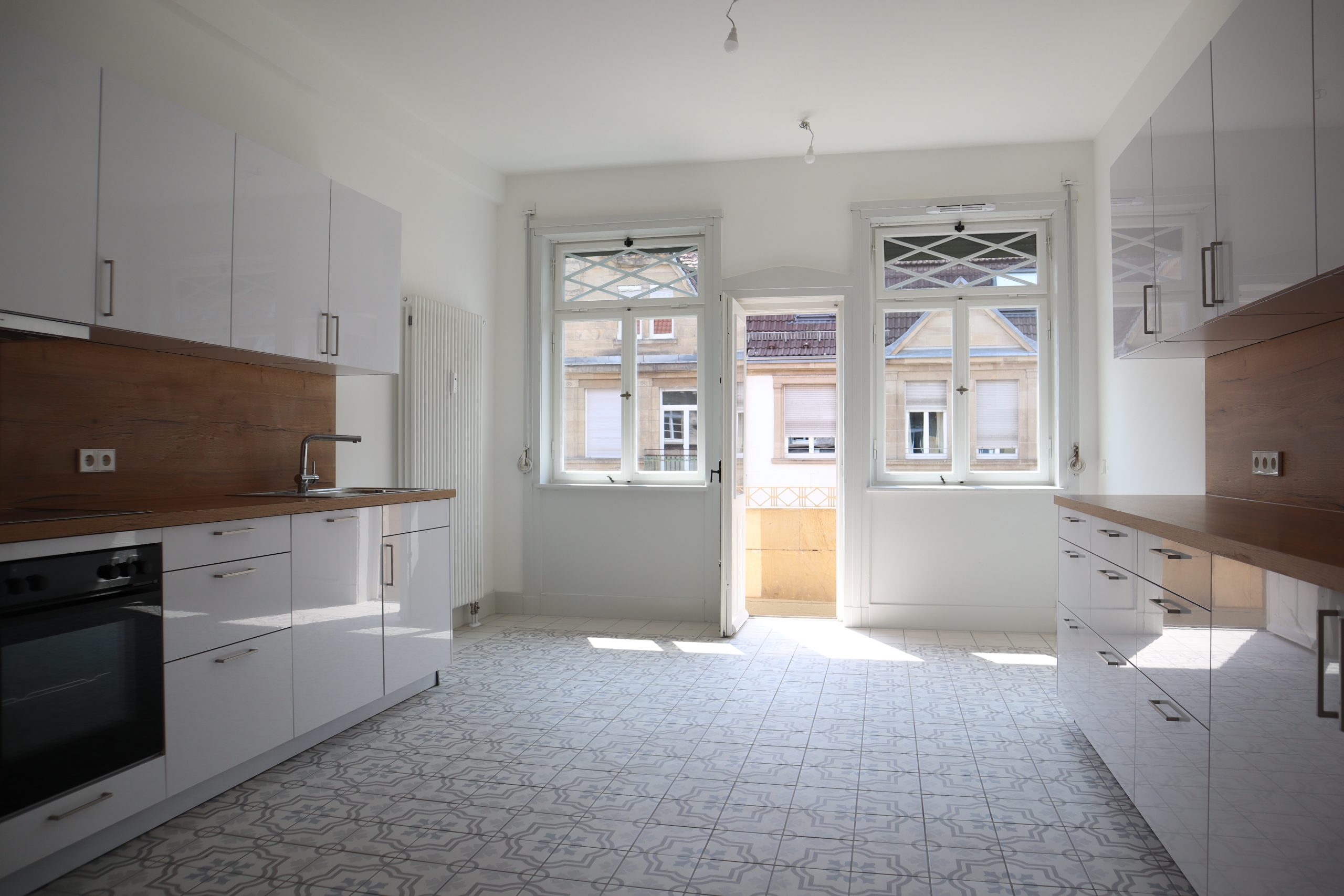 Zwei Balkone ermöglichen sonnige Stunden im Freien. Der Fußboden in Fischgrät-Eichenparkett erinnert an das historische Original, während in den Bädern und in der Küche Fliesen im Stil der Bauzeit harmonisch eingesetzt wurden.