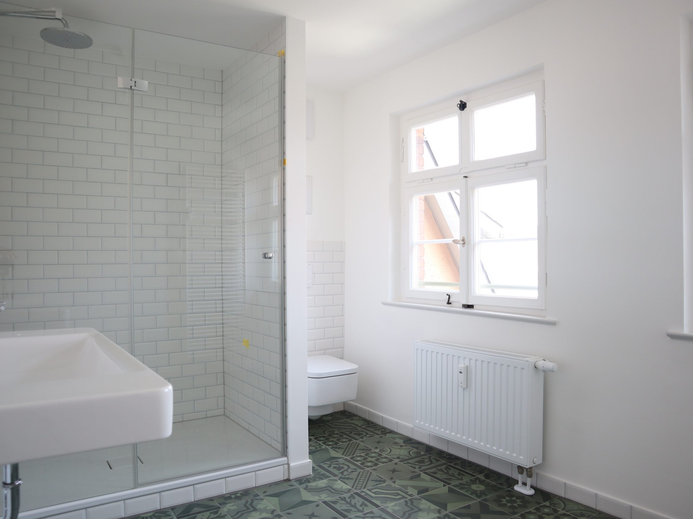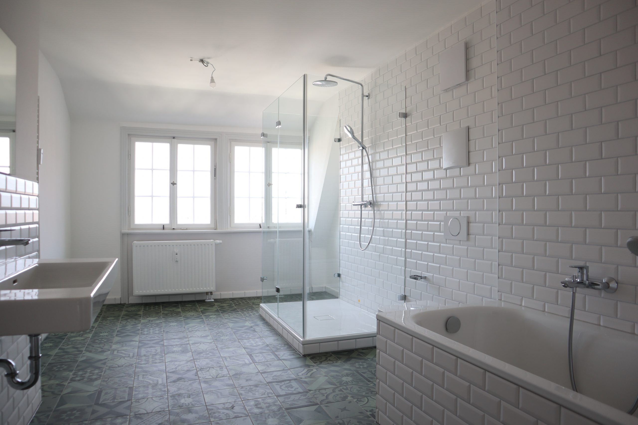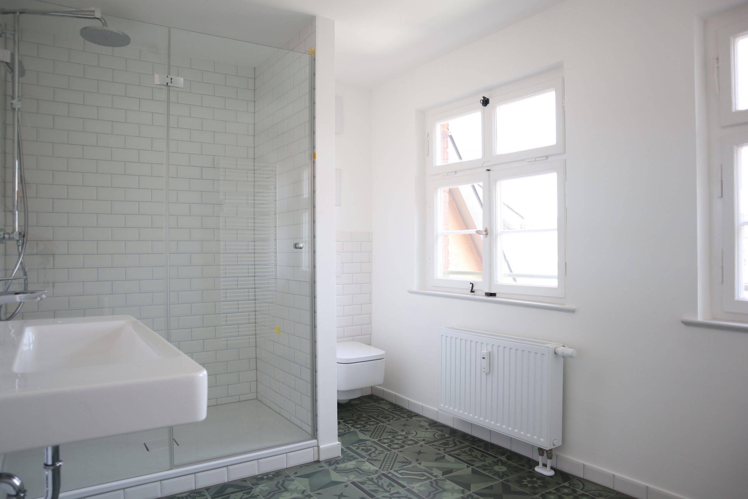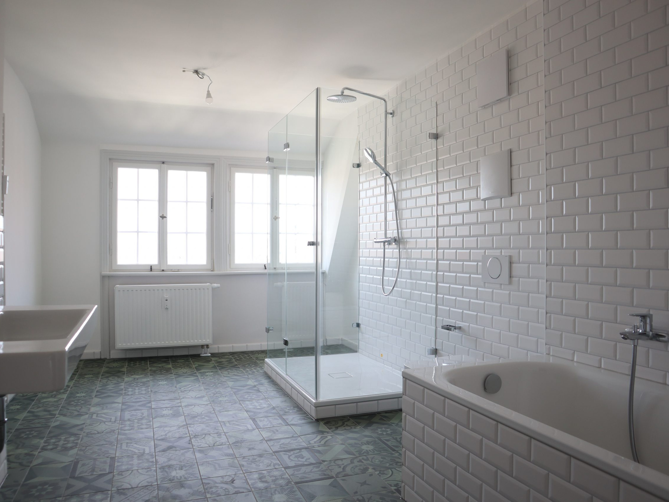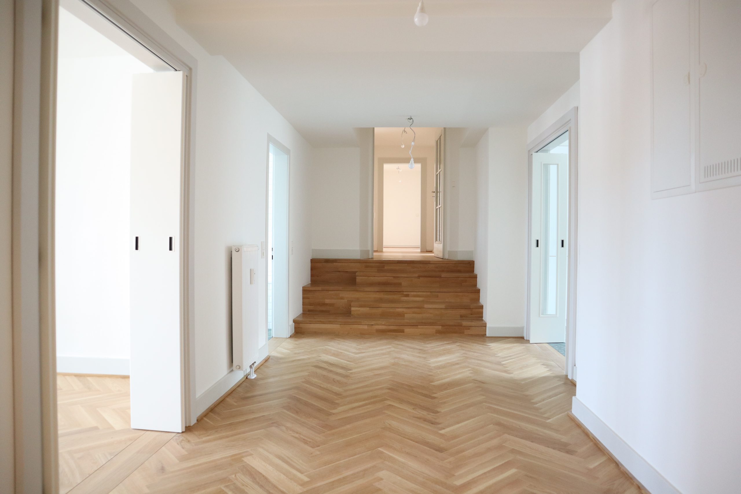 Der Fußboden in Fischgrät-Eichenparkett erinnert an das historische Original, während in den Bädern und in der Küche Fliesen im Stil der Bauzeit harmonisch eingesetzt wurden.