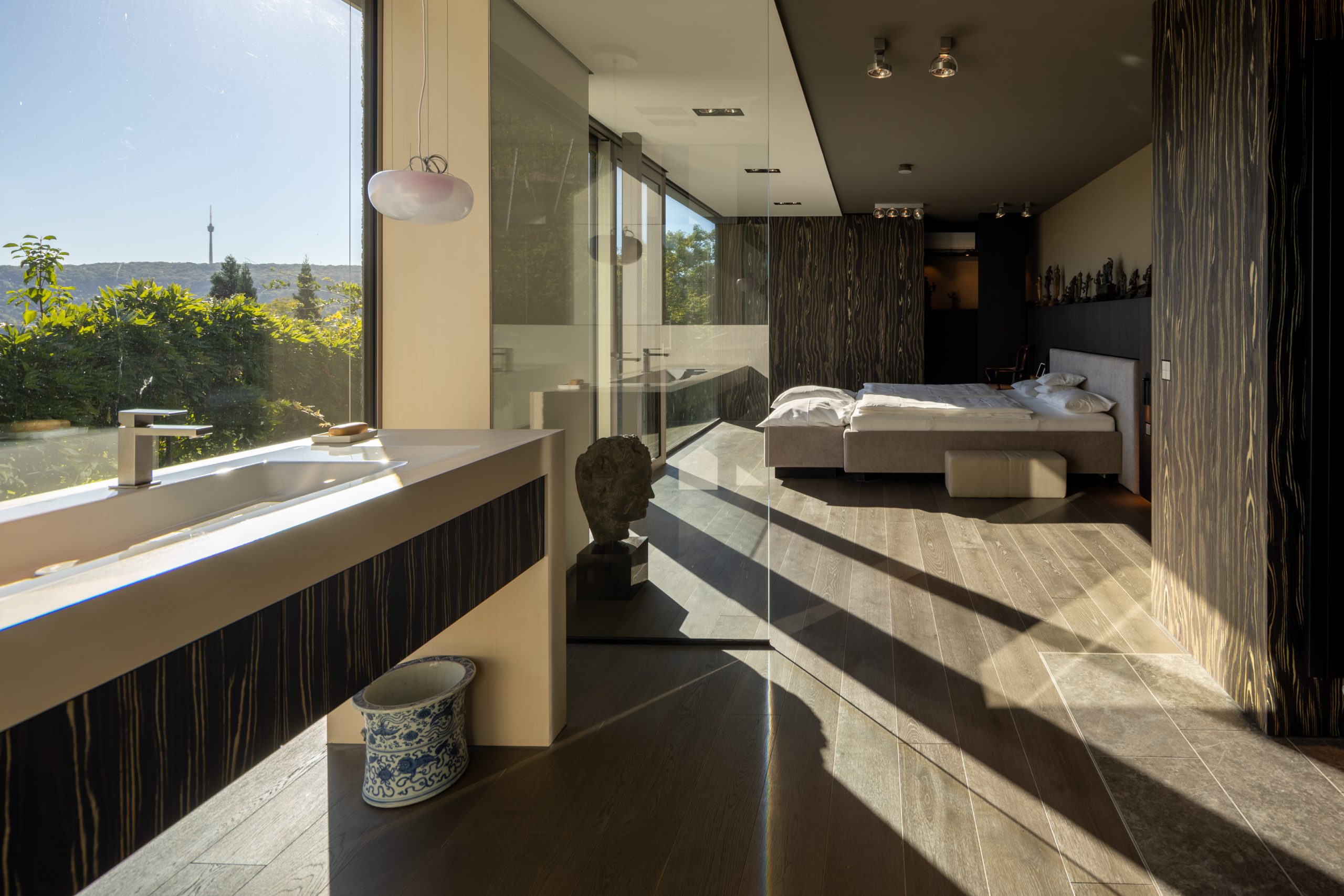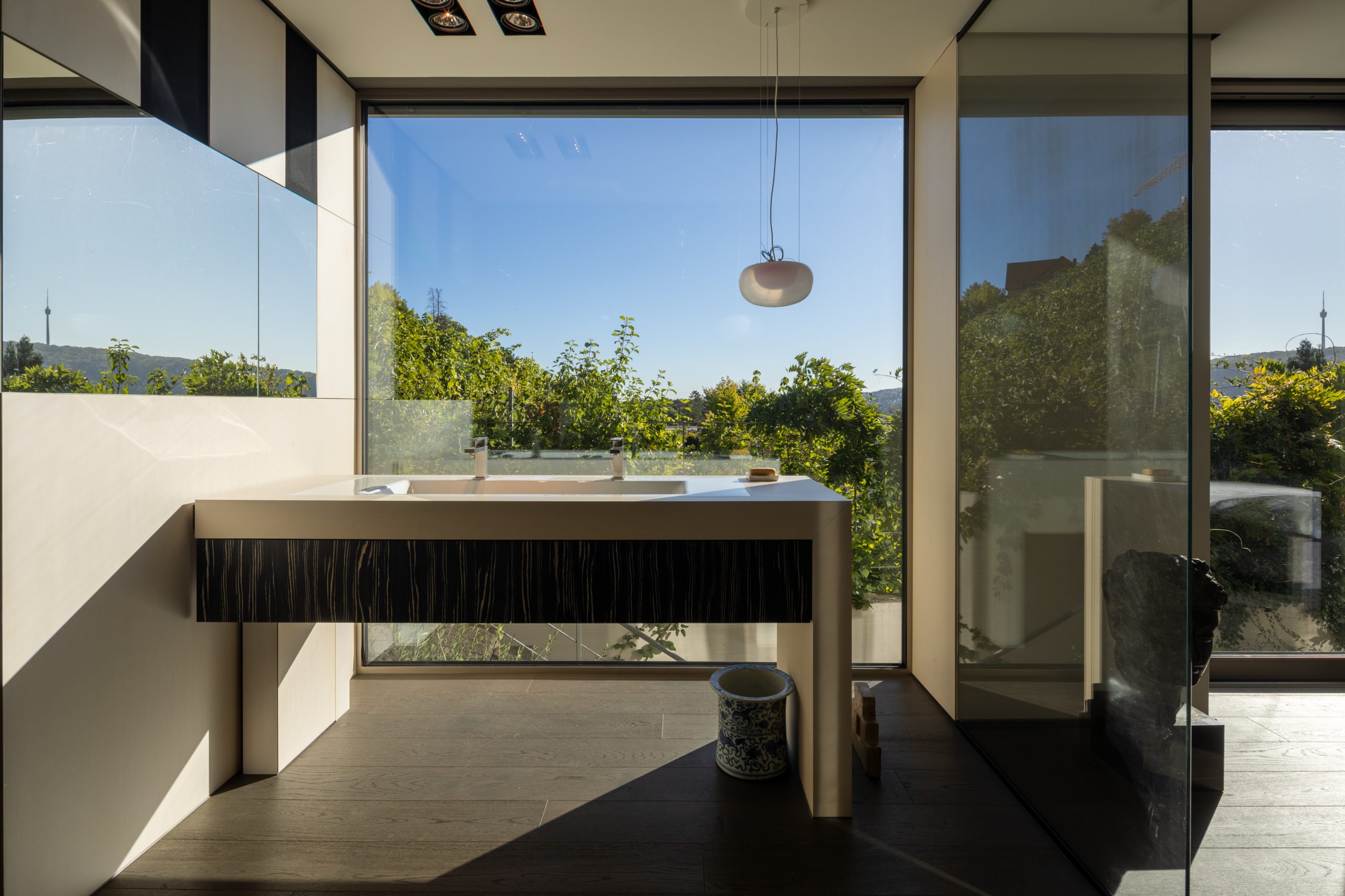Die lichtdurchfluteten Räume verteilen sich auf zwei Ebenen und schaffen ein offenes, elegantes Wohngefühl. Großzügige Panoramafenster holen die umliegende Natur und den herrlichen Blick über Stuttgart direkt ins Haus. Hochwertigste Materialien, eine moderne Haustechnik und ein durchdachtes Raumkonzept verbinden zeitlose Architektur mit zeitgemäßem Wohnkomfort.